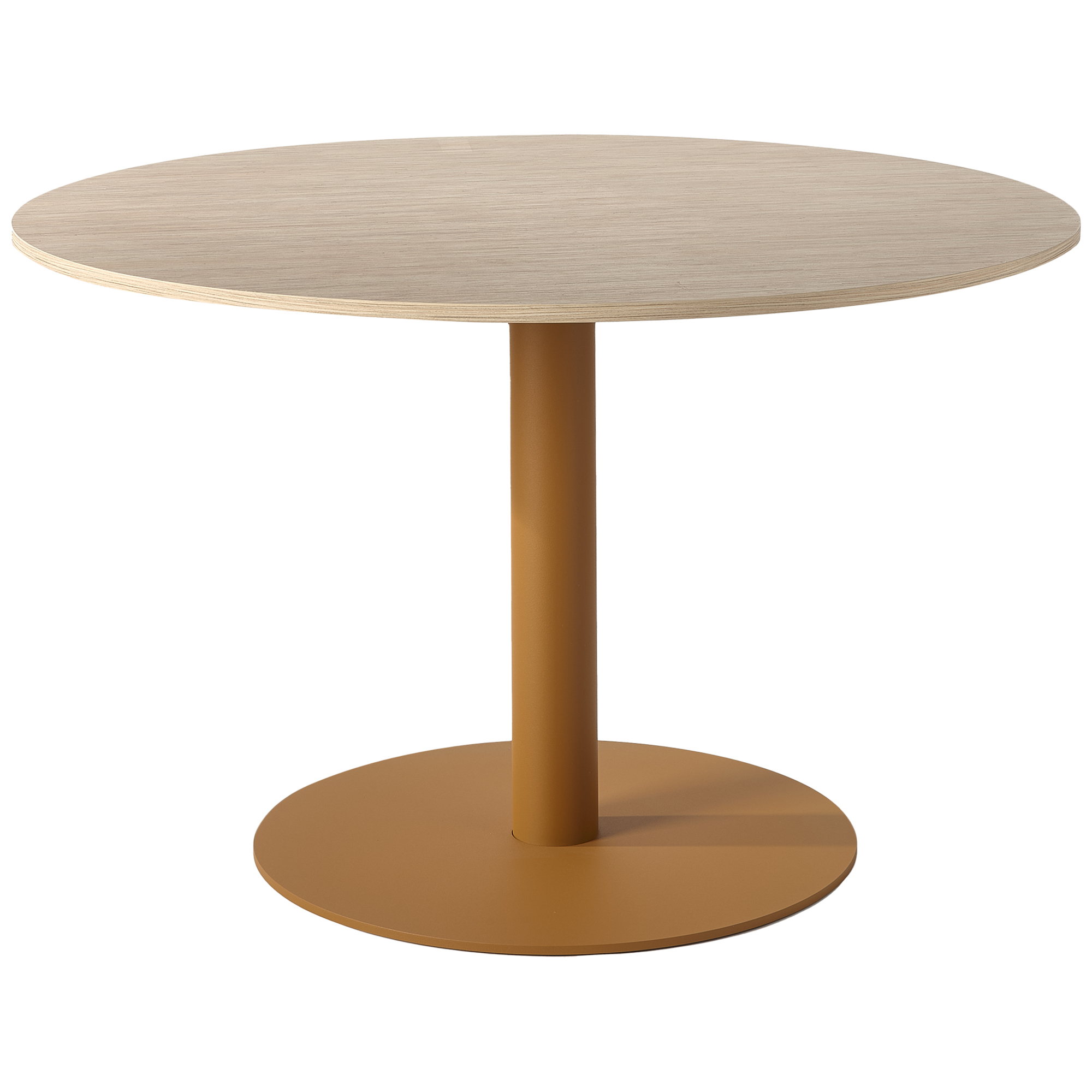 Stijlvolle, ronde dinertafel met een kleurrijke tafelpoot en een tafelblad van gemelamineerd spaanplaat (decor Bamboe LK09). Het onderstel is leverbaar in 4 kleuren: